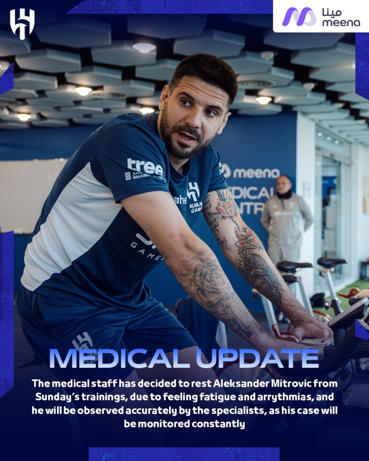 利雅得新月官方写道:“由于感到疲劳和心律不齐,医务人员决定让米特洛维奇在周日的训练中休息,专家将对他进行精确观察,他的情况会得到持续检测。”