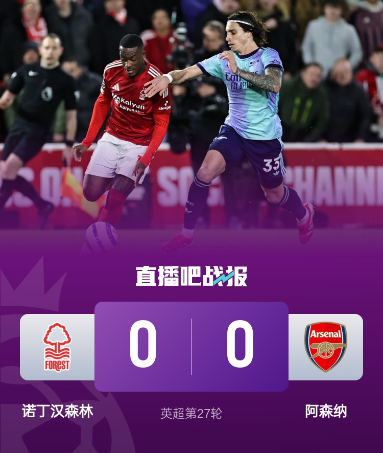 拉亚献神扑,最终阿森纳0-0诺丁汉森林,两轮不胜后距榜首13分。