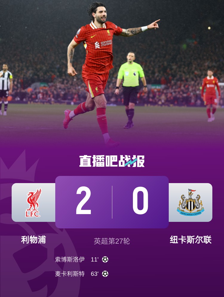 多赛1场13分领跑!利物浦2-0纽卡联赛24轮不败 索博&麦卡建功