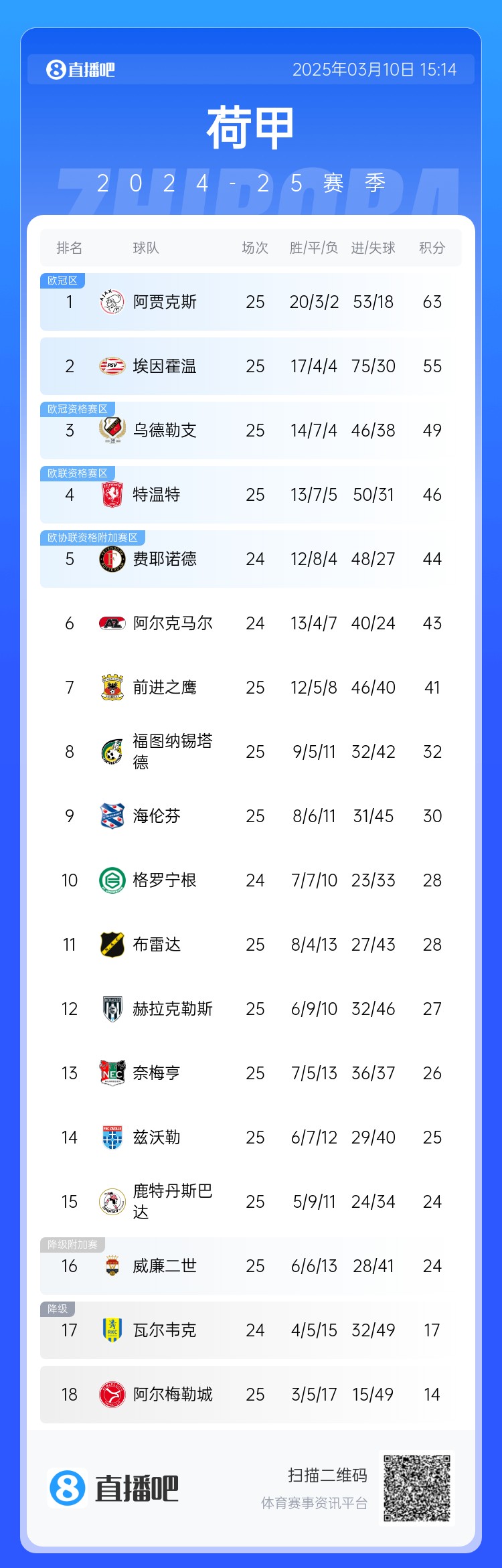 荷甲积分榜↓