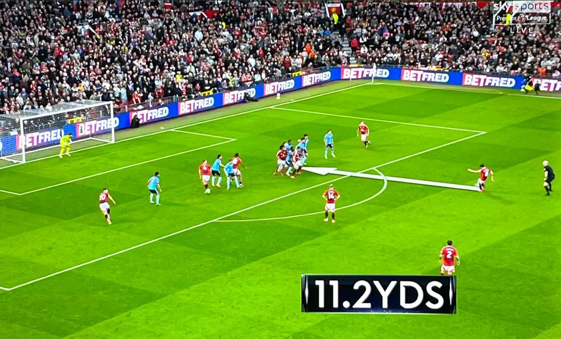 而赛中的转播镜头也刻意给出了数字,镜头显示,B费的罚球点距离阿森纳的人墙足足有11.2码(约为10.24米),而规则要求的人墙与罚球点距离一般只有10码(9.15米)。