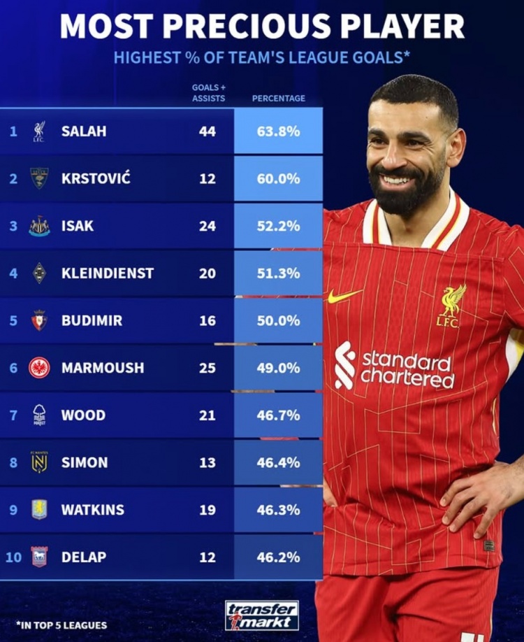 3月11日讯 《转会市场》统计了本赛季五大联赛直接参与进球占全队总进球的比率情况,萨拉赫无悬念居首,已经转会曼城的马尔穆什依然是法兰克福队内最高。