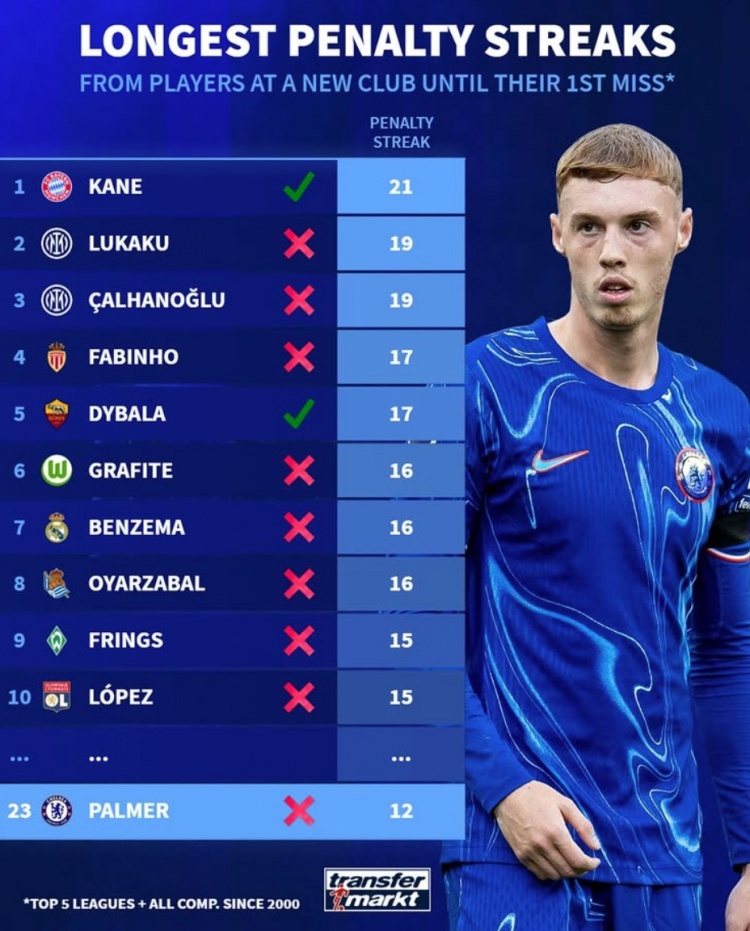 《转会市场》统计了新世纪以来五大联赛球员在新东家在不罚丢情况下连续命中点球纪录,凯恩21球居首并且仍未罚丢。