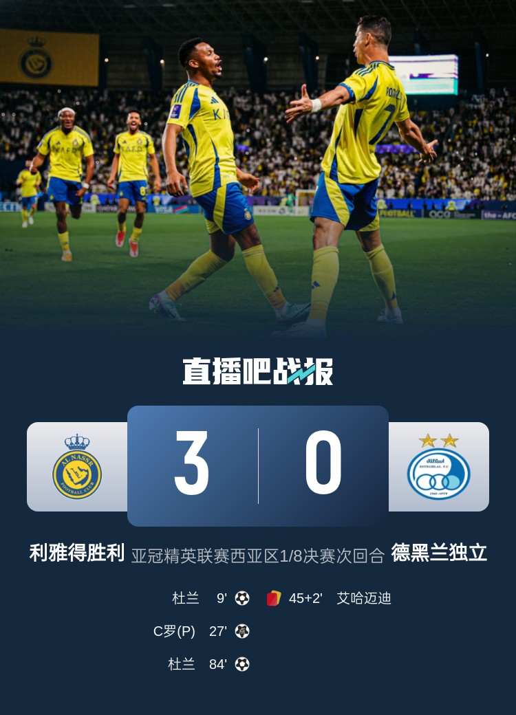 亚冠精英联赛西亚区1/8决赛次回合,C罗进球,杜兰梅开二度,利雅得胜利3-0德黑兰独立,晋级亚冠八强。
