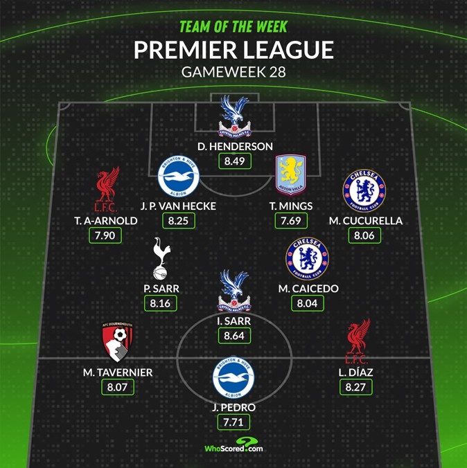 3月11日讯 英超第28轮联赛已经完赛,whoscored也评出了本轮联赛最佳阵容,利物浦和切尔西各2人入围。