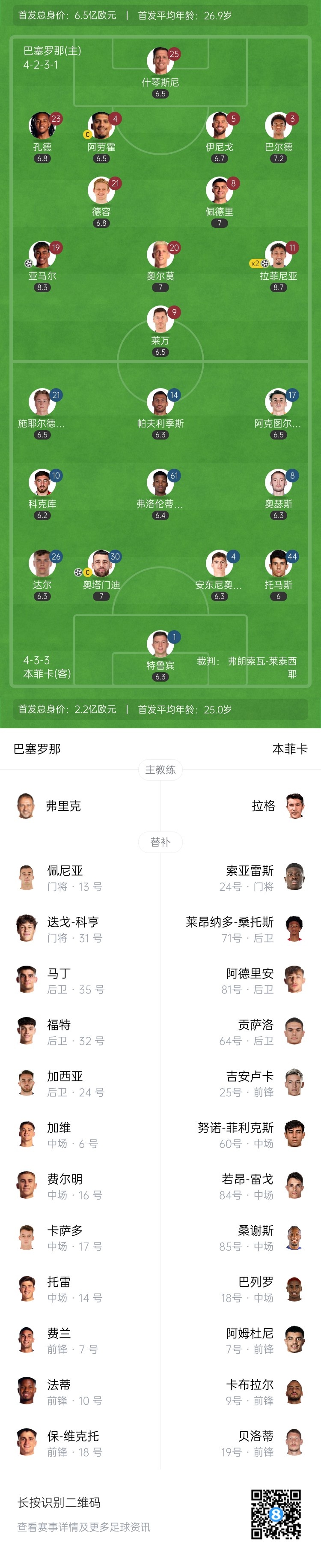 3月12日讯 北京时间1:45,欧冠1/8决赛次回合巴塞罗那主场迎战本菲卡,首回合巴萨1-0占得先机。比赛在奥林匹克球场打响!上半场,亚马尔助攻拉菲尼亚破门;奥塔门迪很快扳平;随后亚马尔左脚禁区外兜射破门!巴尔德反击助攻拉菲尼亚完成双响!半场结束,巴萨暂3-1领先本菲卡,总比分4-1!