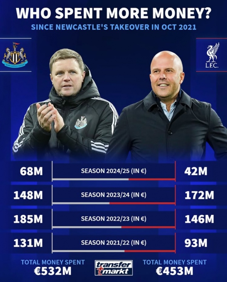 - 纽卡被沙特收购后4年共投资5.32亿欧元,同期利物浦4.53亿欧