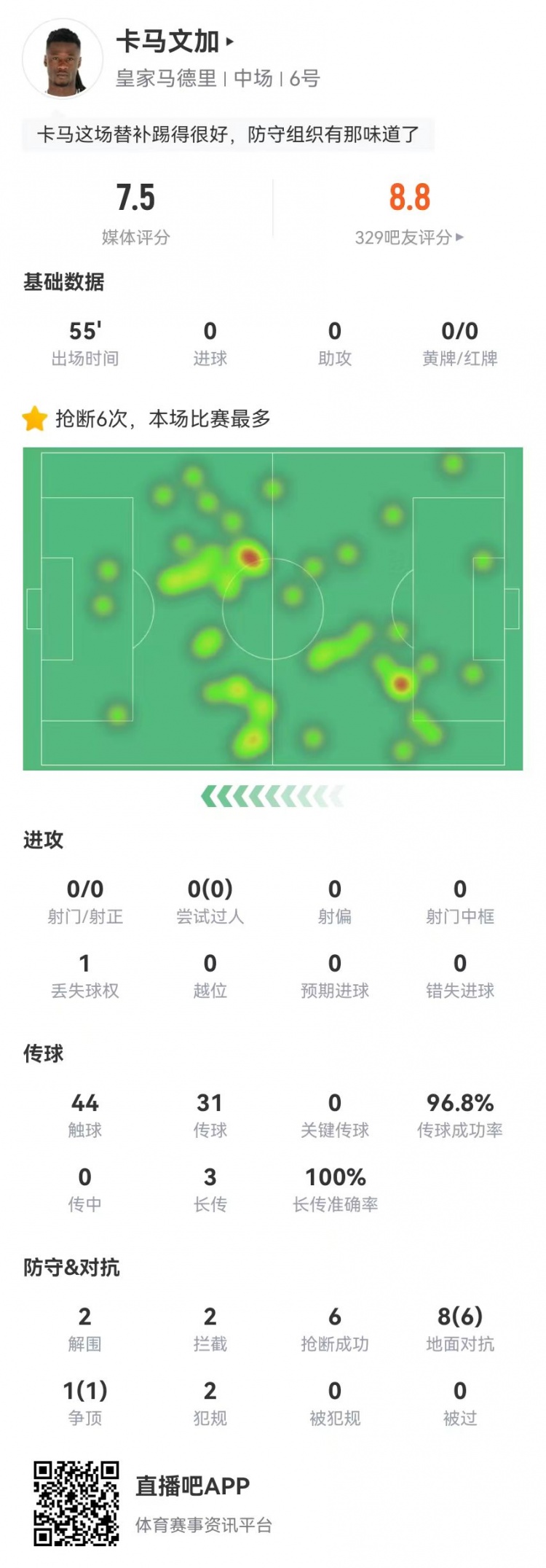 卡马文加替补9对抗7成功+6抢断2解围2拦截 3长传3成功 获7.5分