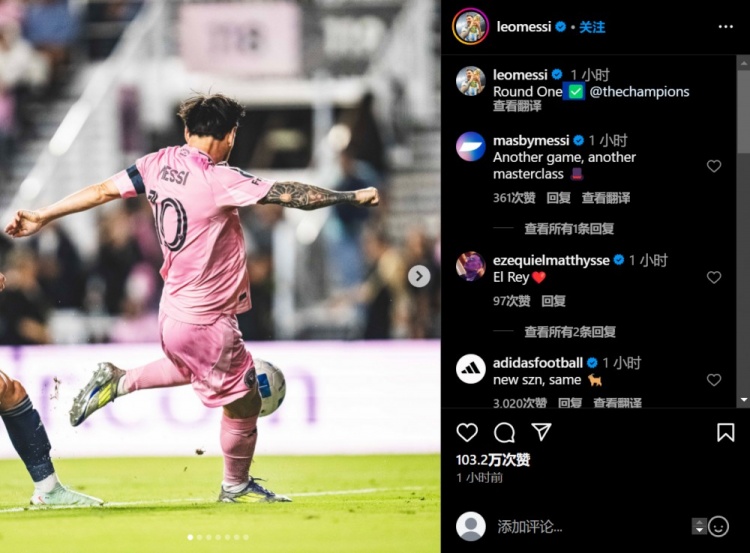 梅西本场打进一记凌空抽射,赛后他在社媒晒出比赛照片,并配文:第一轮✅。