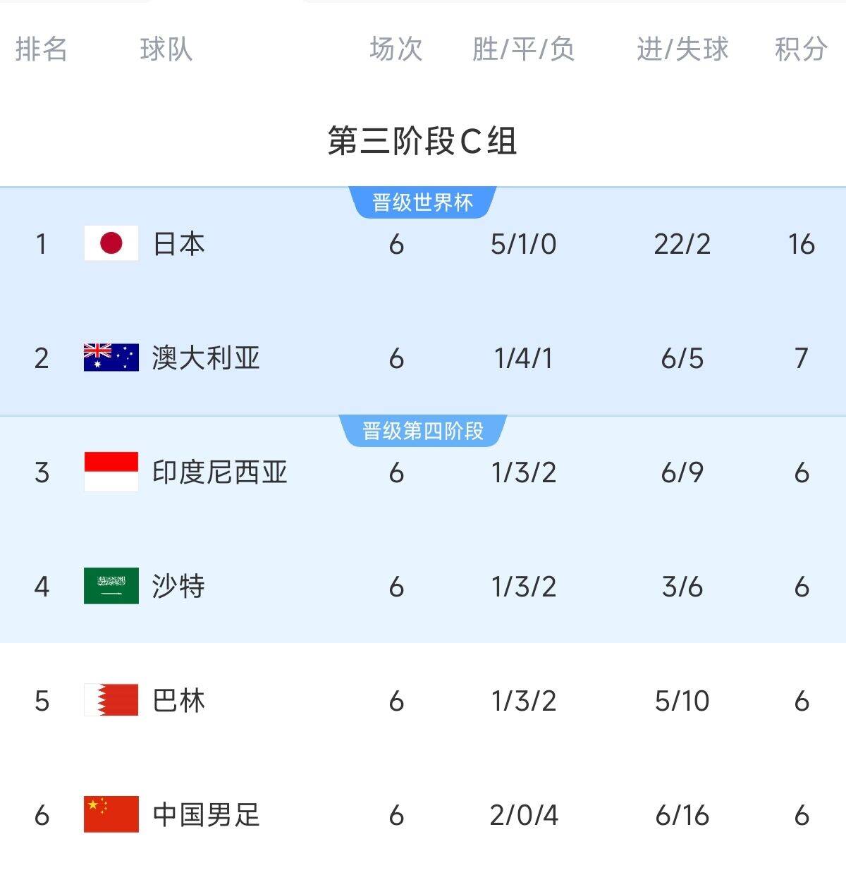 日本队所在小组积分榜