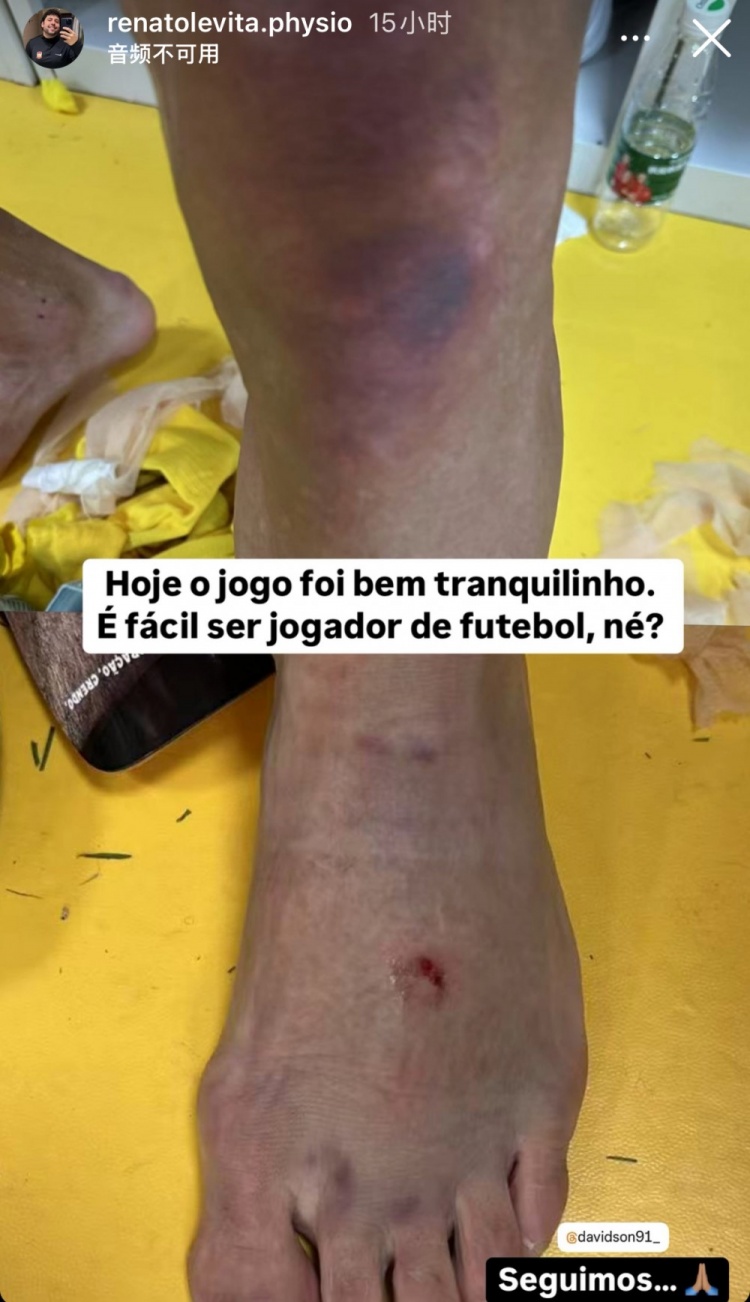3月4日讯 中超第二轮青岛西海岸2-0击败武汉三镇的比赛结束后,西海岸理疗师在社媒晒出了戴维森腿部的照片。