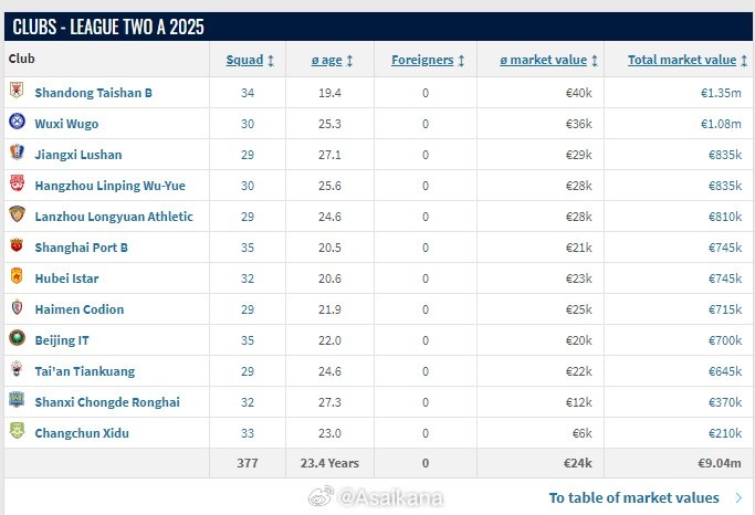 - 中乙球队身价更新:山东泰山B队以135万欧元排在第一