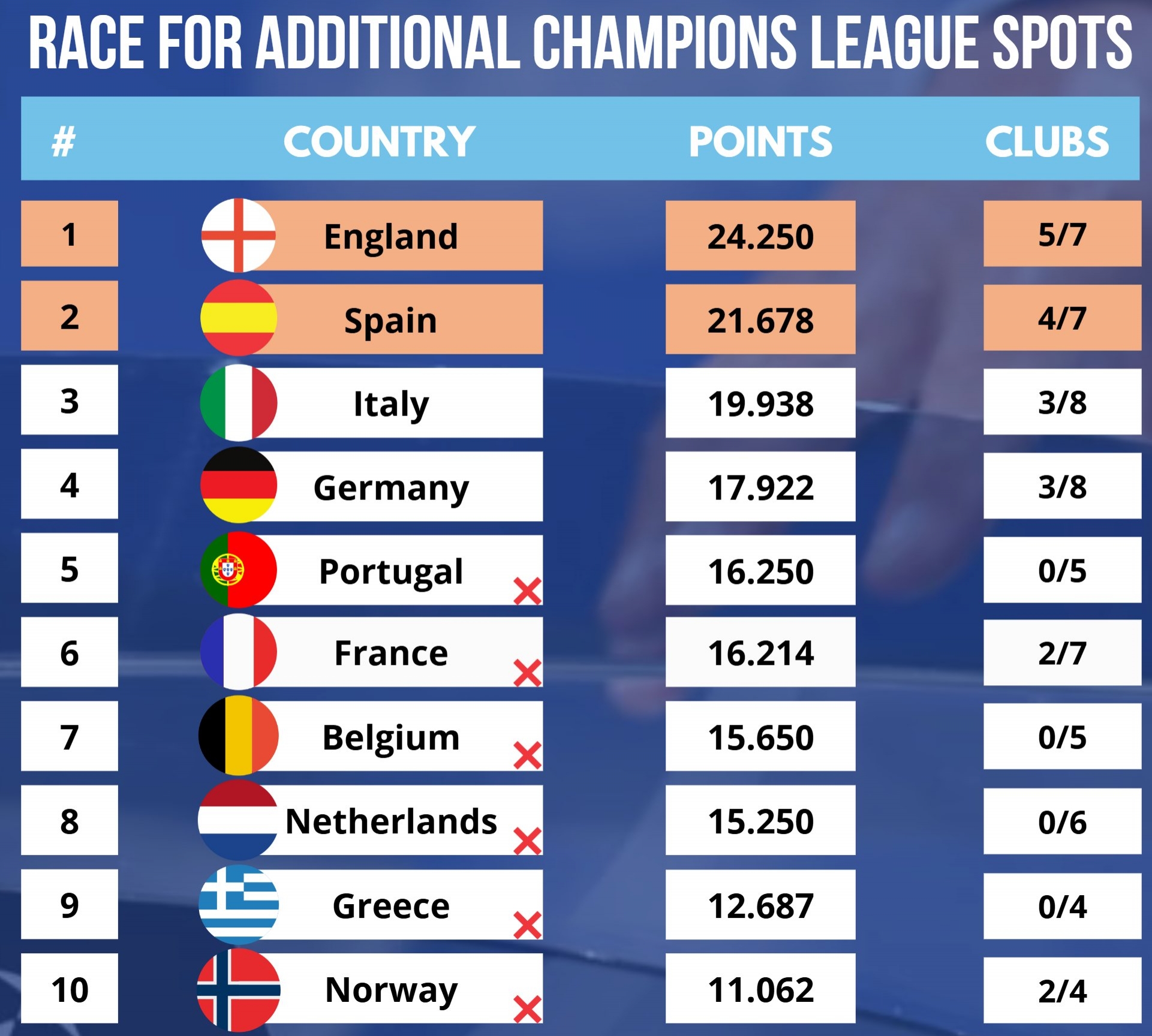 24/25赛季最新欧战积分(前2名获额外欧冠名额):