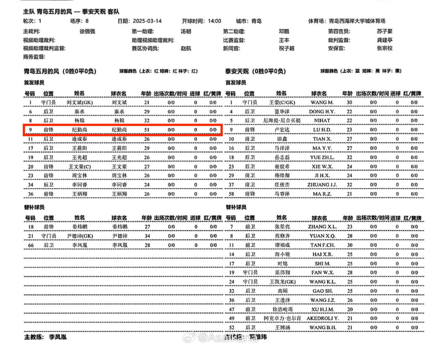 中冠球队青岛五月的风将对阵中乙球队泰安天贶。根据首发名单,青岛五月的风投资人、51岁的纪勤尚将先发出战,担任前锋。