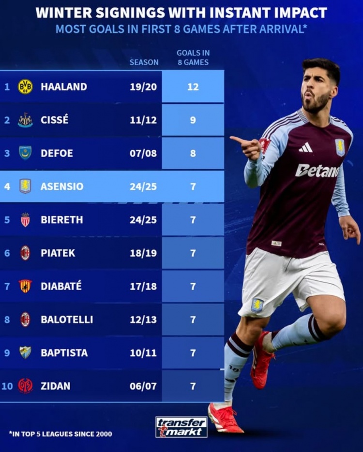 - 新世纪五大联赛冬窗新援前8场:哈兰德12球 阿森西奥&皮亚特克7球