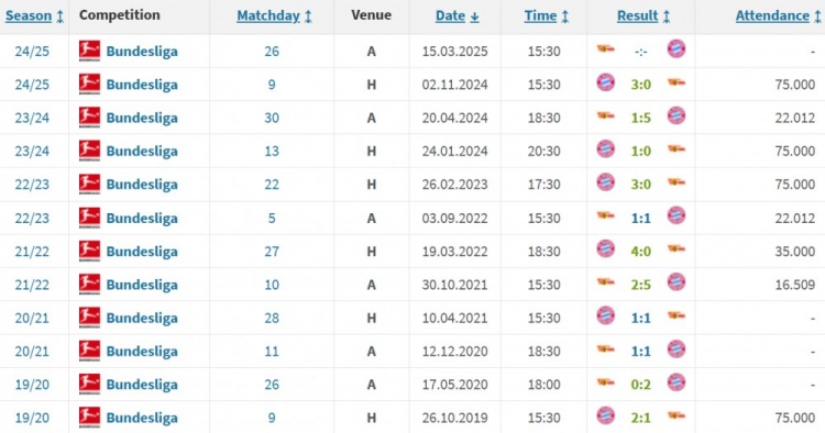 据德转数据统计,两支球队历史上曾11次交手(均是德甲比赛),拜仁8胜3平未尝败绩,共计打进28球丢7球。