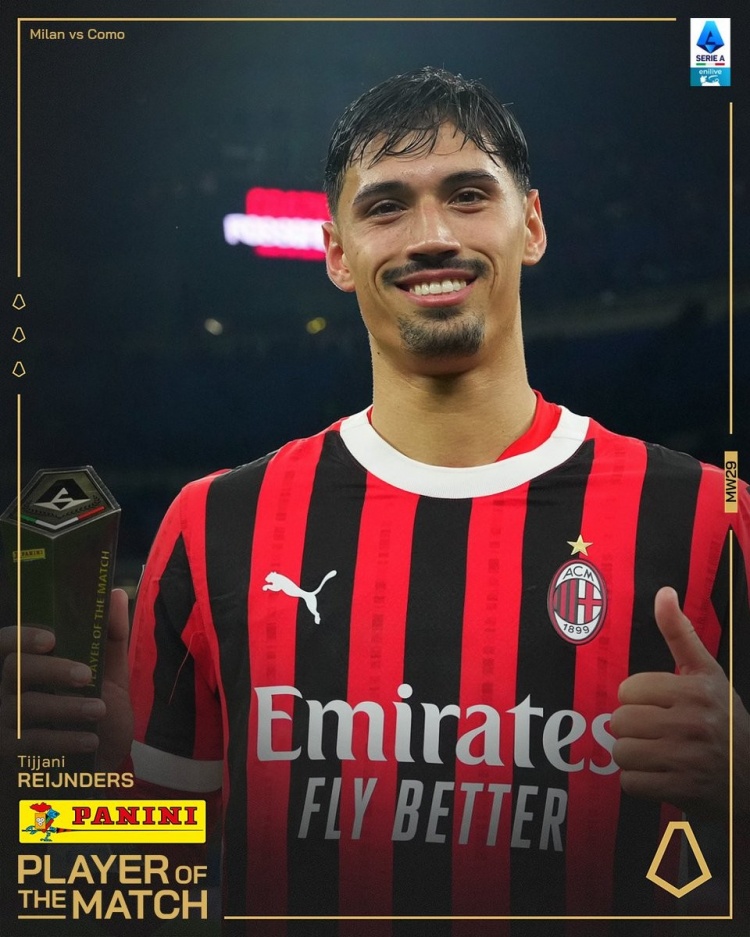 传射建功!官方:赖因德斯当选米兰vs科莫全场最佳球员