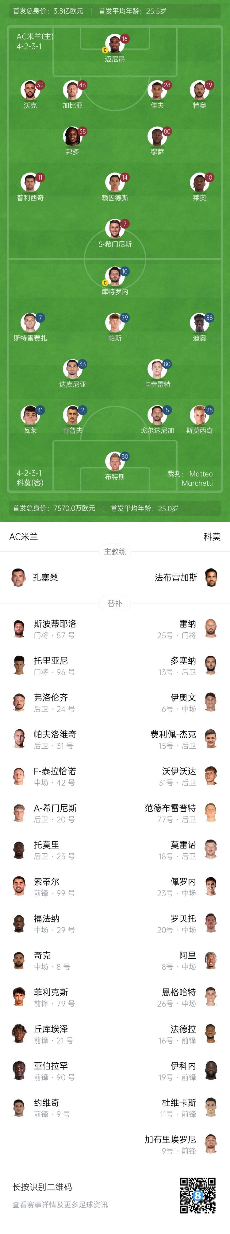 AC米兰vs科莫首发:S-希门尼斯、莱奥先发 普利西奇、邦多出战