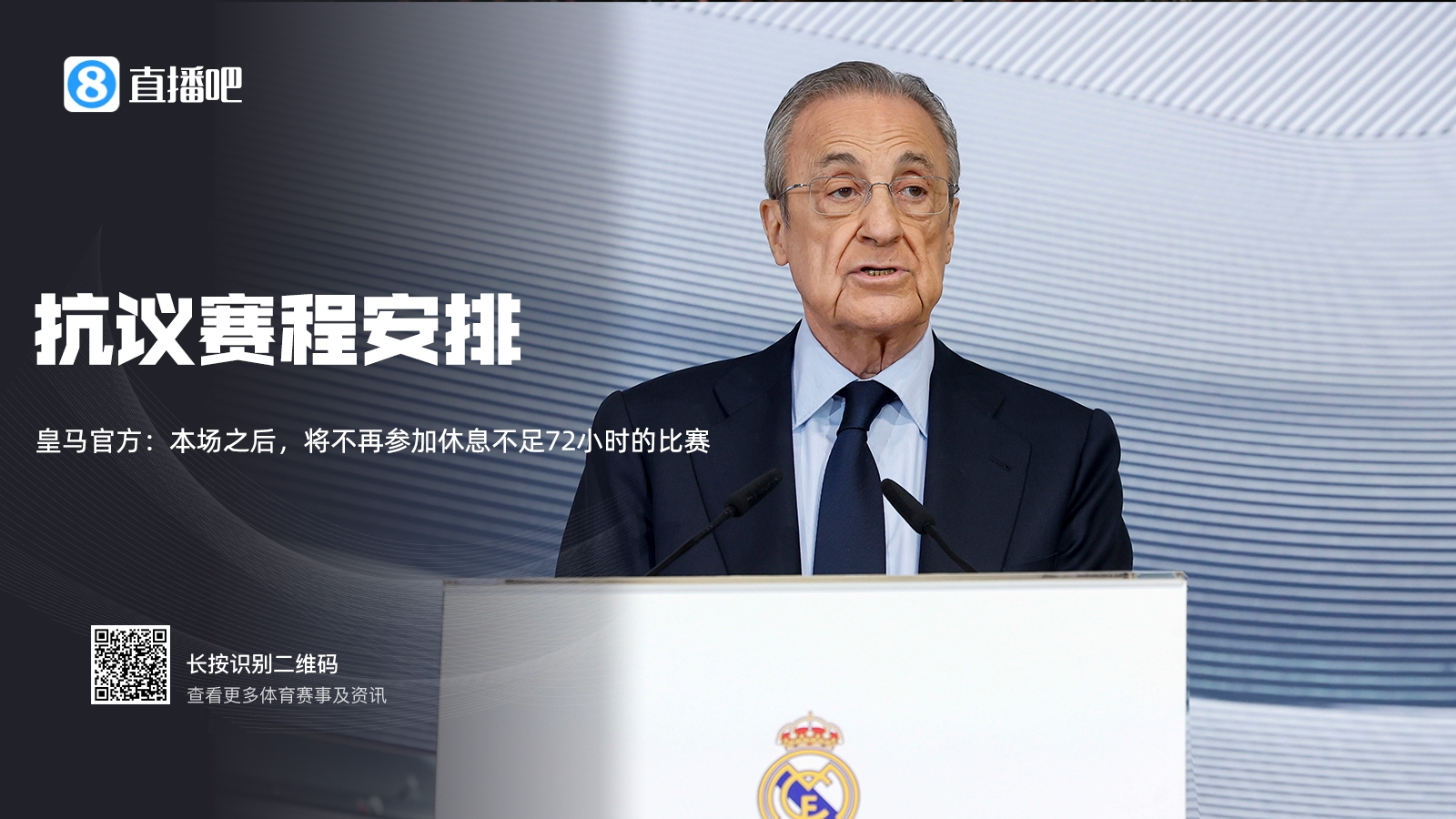 皇马官方通过皇马电视台RMTV发布,皇马将不再参加任何不符合国际足联建议的、比赛休息时间不足72小时的比赛。