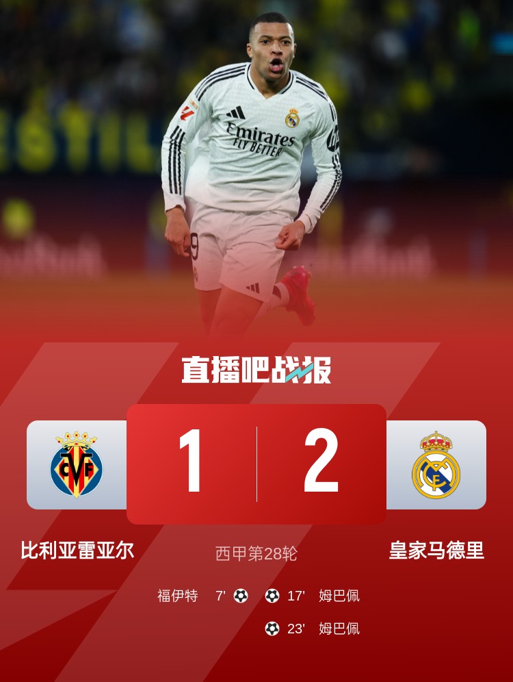 西甲第28轮,皇马2-1逆转比利亚雷亚尔,姆巴佩梅开二度。