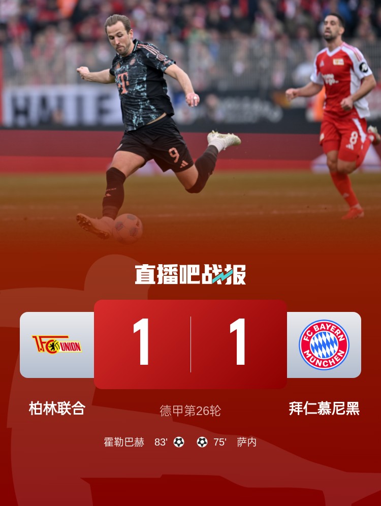 德甲第26轮,拜仁客场1-1柏林联合,萨内替补建功,乌尔比希失误。