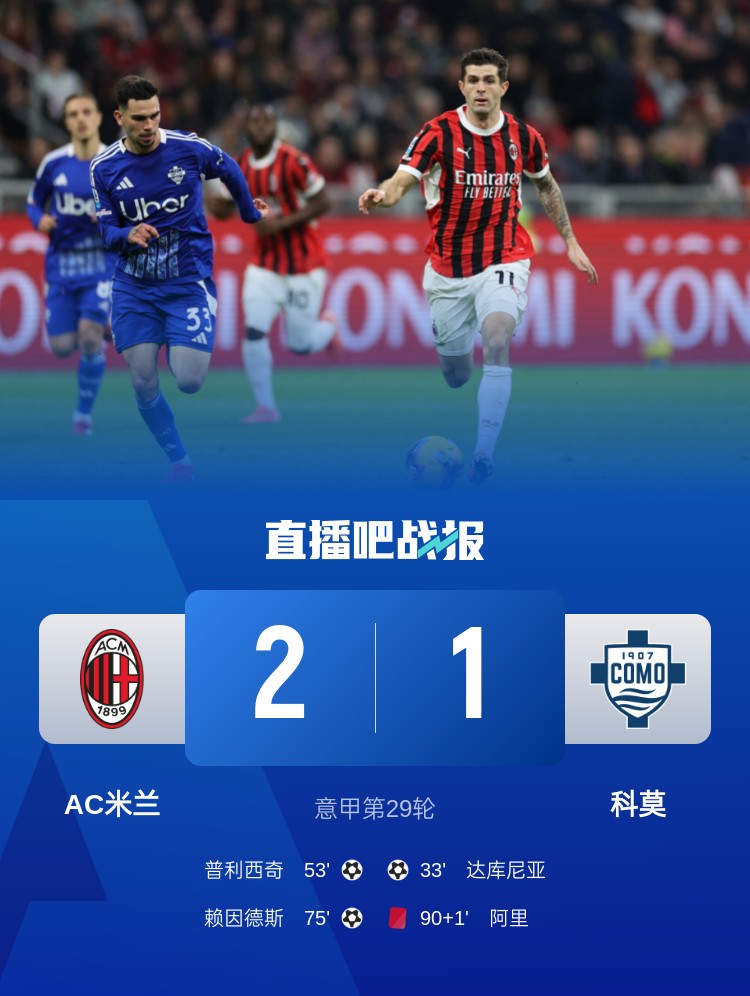 意甲第29轮AC米兰2-1逆转科莫,赖因德斯传射,阿里首秀红牌。
