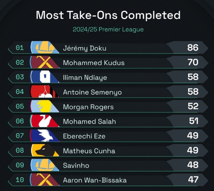 本赛季英超成功过人榜:多库86次领跑,萨拉赫、萨维尼奥在列