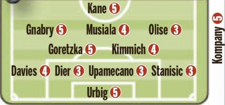 首发:乌尔比希5分/戴维斯4分、戴尔3分、于帕梅卡诺3分、斯坦尼西奇3分/格雷茨卡5分、基米希4分/格纳布里5分、穆西亚拉4分、奥利塞3分/凯恩5分