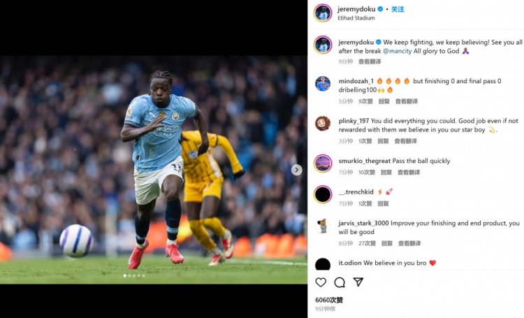不过他依然展现出良好心理素质,在赛后晒出自己的比赛照并鼓励道:“我们继续战斗,我们依然坚信!和大家在国家队比赛周之后再见!@曼城俱乐部。荣耀归于上帝。”