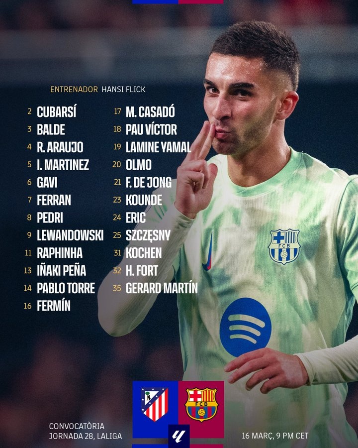 3月16日讯 北京时间明天凌晨4点,巴萨将在西甲客场挑战马竞,巴萨现在公布了比赛名单。