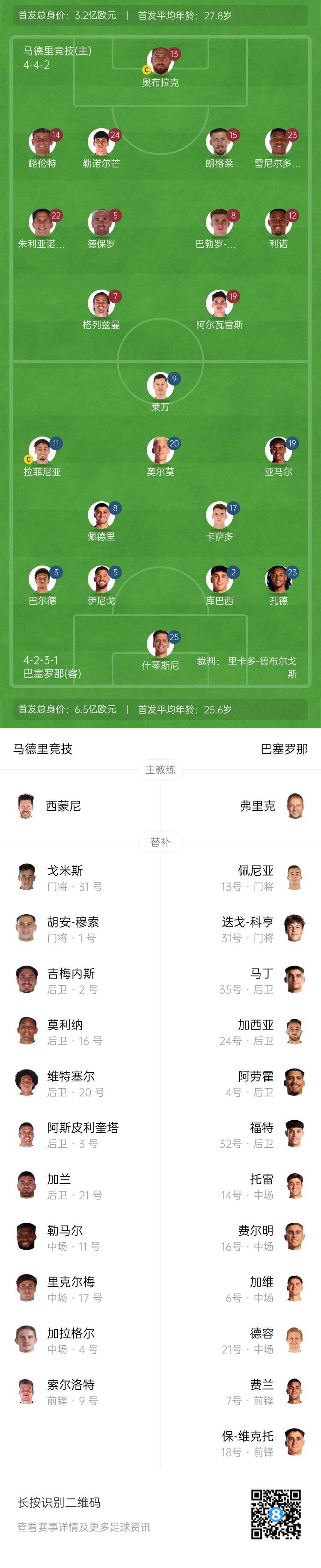 - 马竞vs巴萨首发:小蜘蛛、格列兹曼先发,莱万、亚马尔出战
