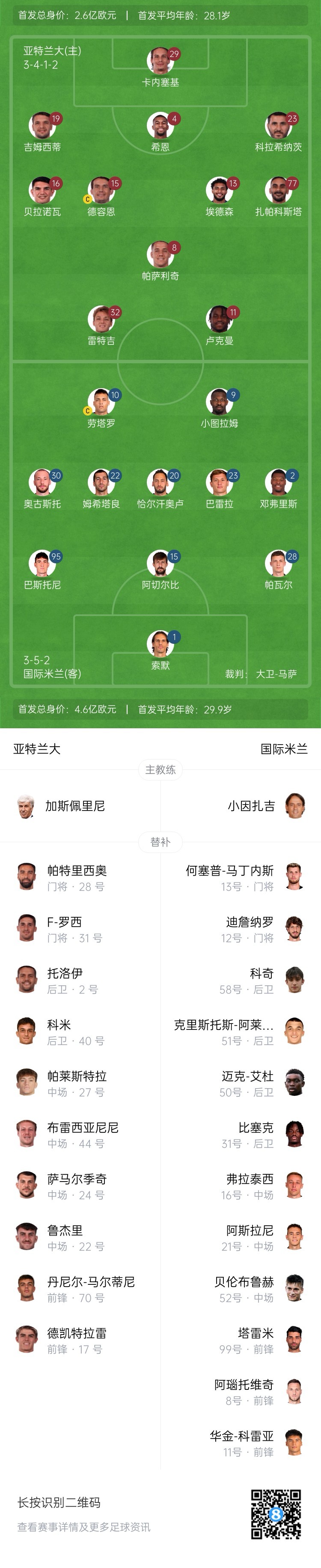 亚特兰大替补:28-帕特里西奥、31-F-罗西、2-托洛伊、17-德凯特拉雷、22-鲁杰里、24-萨马尔季奇、27-帕莱斯特拉、40-科米、44-布雷夏尼尼、70-丹尼尔-马尔蒂尼