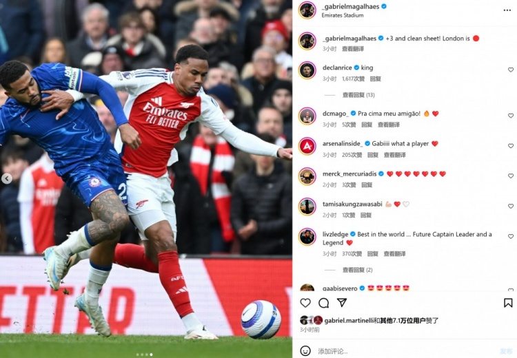 本场比赛加布里埃尔发挥出色,赛后当选英超官方球迷票选全场最佳,赛后他也在社媒晒出本场与里斯-詹姆斯对抗照片,配文写道:“拿下三分并完成零封,伦敦是红色的!”