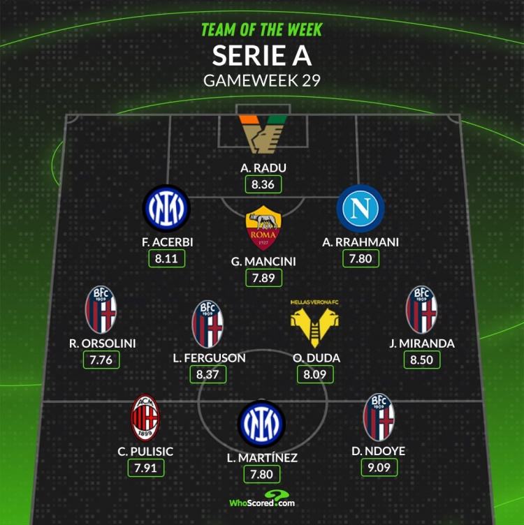 3月17日讯 WhoScored根据球员的评分列出了意甲第29轮最佳阵容,劳塔罗、阿切尔比、普利西奇在列,博洛尼亚4名球员入选。
