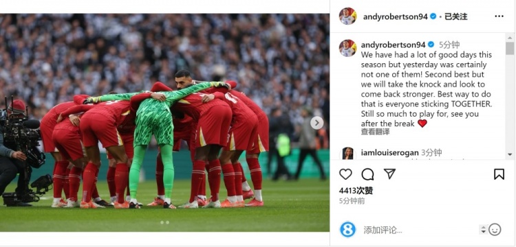 罗伯逊在社交媒体上晒出球员们围在一起打气的照片,并写道:“本赛季我们有过很多美好的日子,但昨天肯定不是其中之一!”