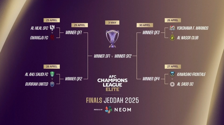 本赛季亚冠精英联赛,从1/4决赛开始为集中赛会制的单场淘汰赛,2025年4月25日至5月4日在沙特举行。