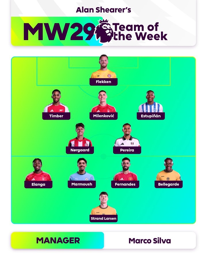 中场:诺尔高(布伦特福德)、佩雷拉(富勒姆)、伊兰加(诺丁汉森林)、马尔穆什(曼城)、B费(曼联)、贝莱加德(狼队)