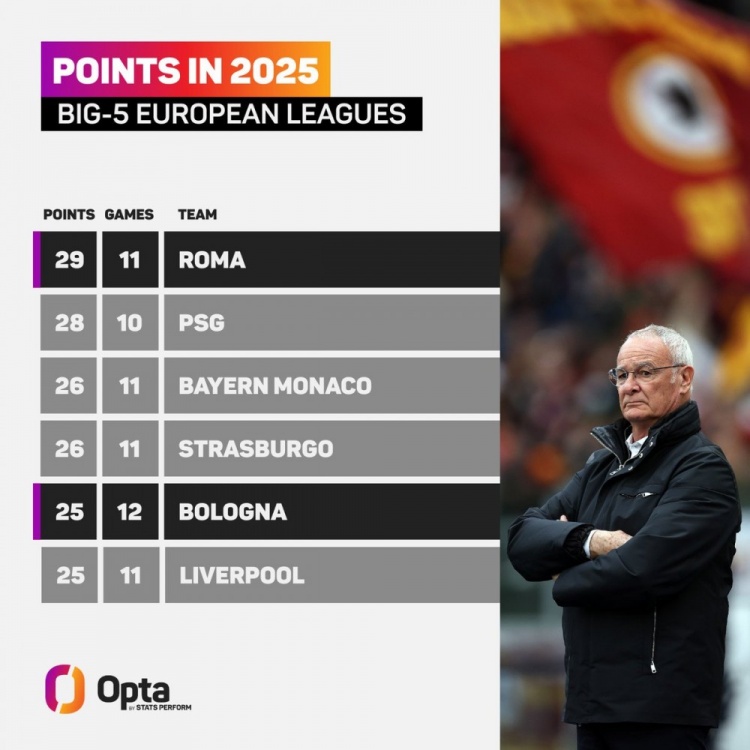 3月18日讯 国家队比赛周来袭,五大联赛暂时告一段落,OPTA也统计了2025年五大联赛拿分情况,罗马居首。