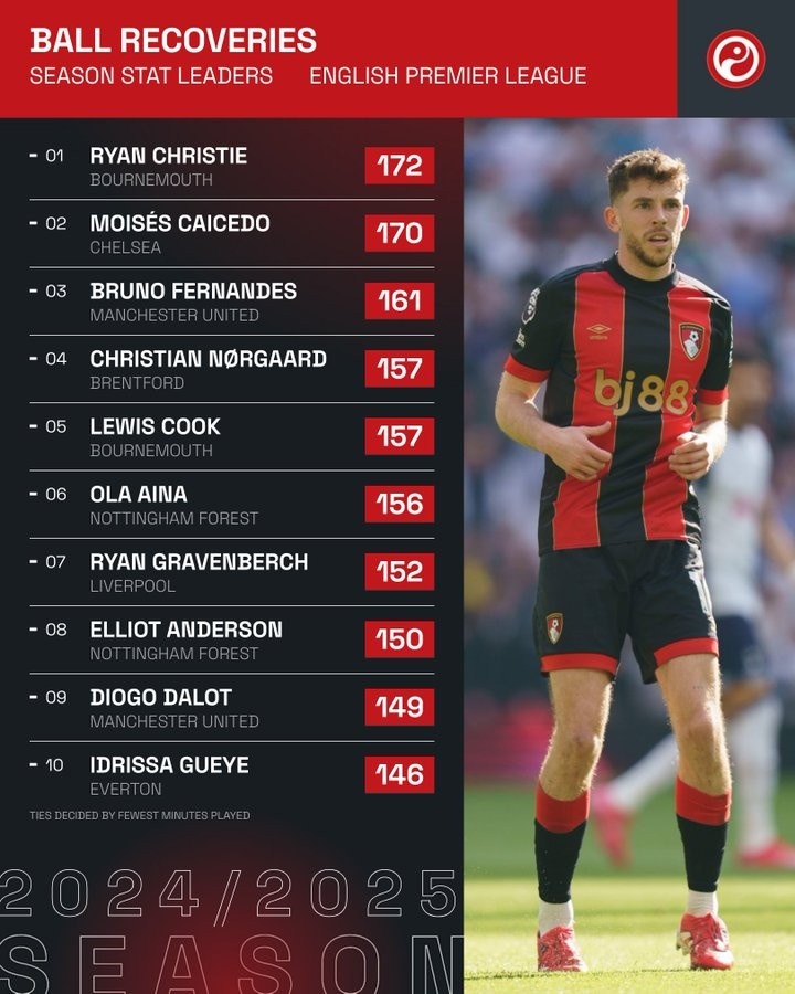 - 本赛季英超赢得球权榜:凯塞多170次第二,B费、赫拉芬贝赫在列