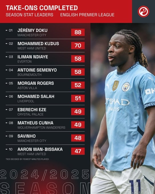 - 本赛季英超成功过人榜:多库88次独自领跑,萨拉赫、萨维尼奥在列