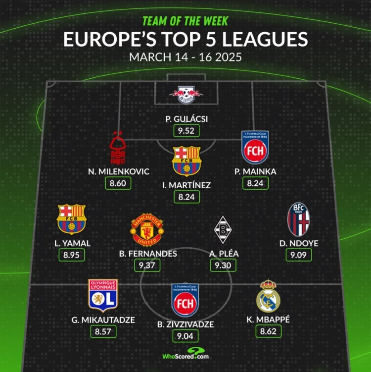 - whoscored本周五大联赛最佳阵:B费领衔,姆巴佩、亚马尔在列