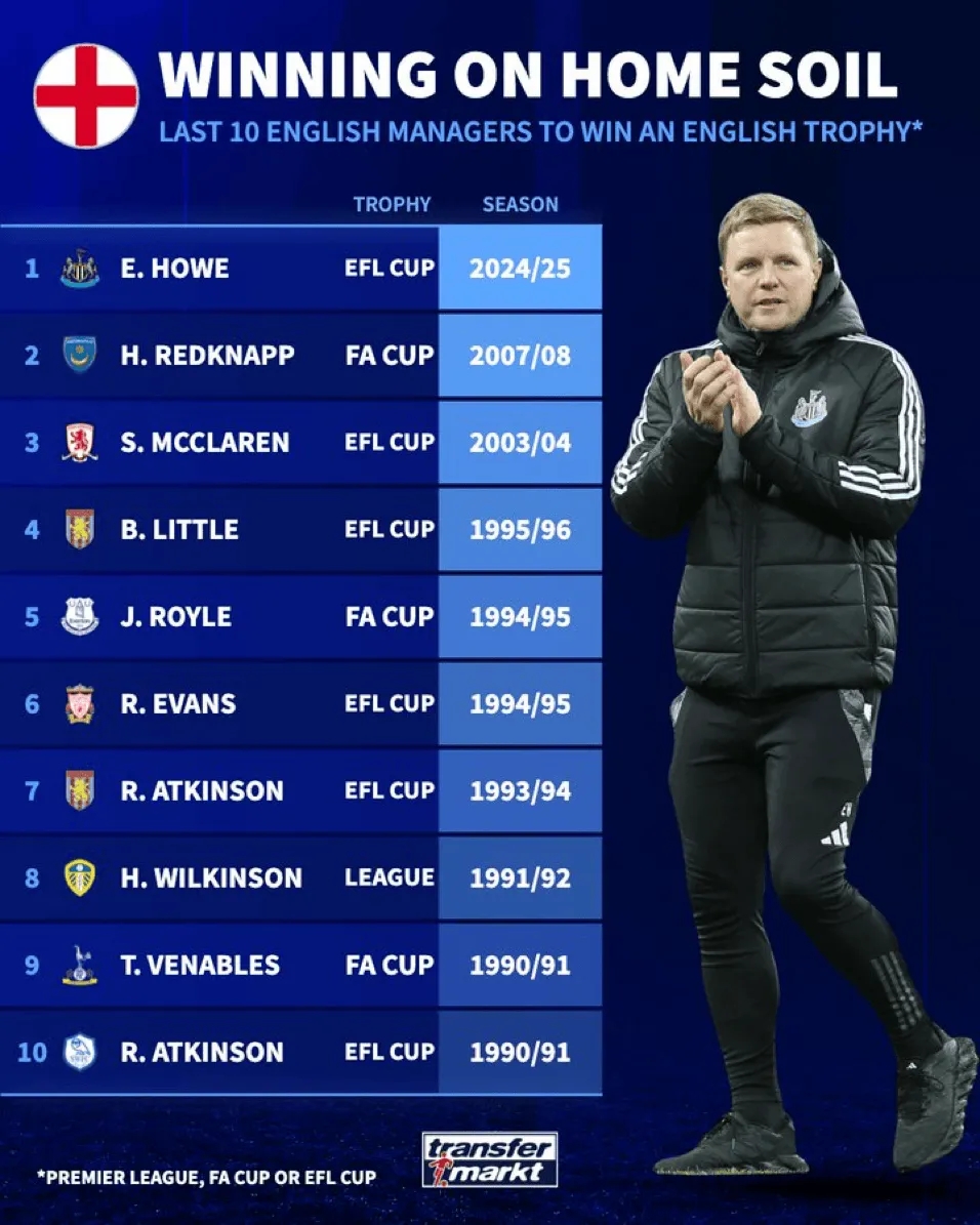3月18日讯 纽卡在昨晚的联赛杯决赛2-1击败利物浦,埃迪-豪也成为近年来首位带队捧得国内冠军的英格兰本土主帅。