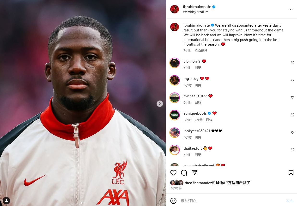 利物浦中卫科纳特在社交媒体上写道:“昨天的比赛结果让我们都很失望,但感谢大家整场比赛都与我们同在。”